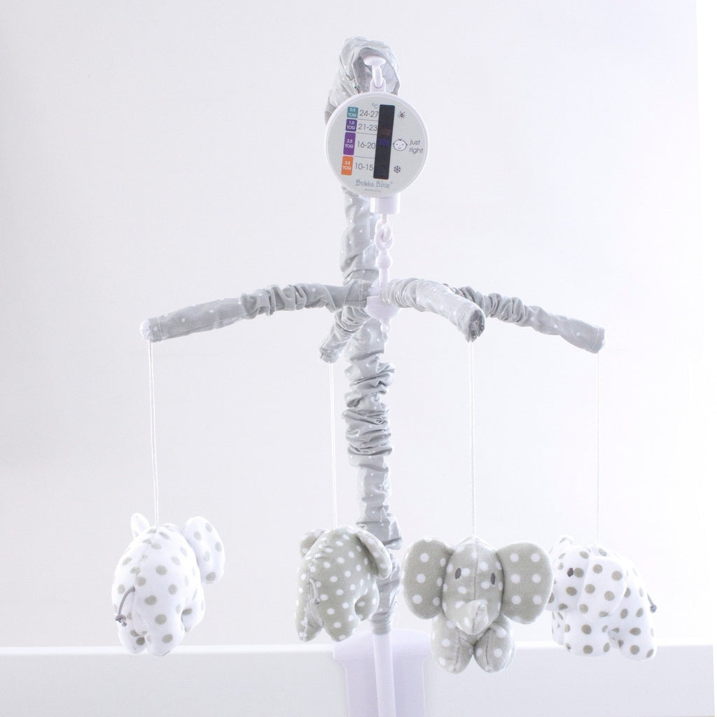 With a simple wind up mechanism our musical mobile from the Bubba Blue Petit Elephant collection soothes baby into a dreamy and relaxing sleep. Featuring whimsical elephants in neutral grey and white with a touch of carnival red. Get ready for spotty dotty elephant fun with this sweet design.