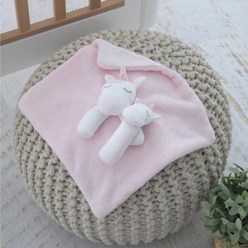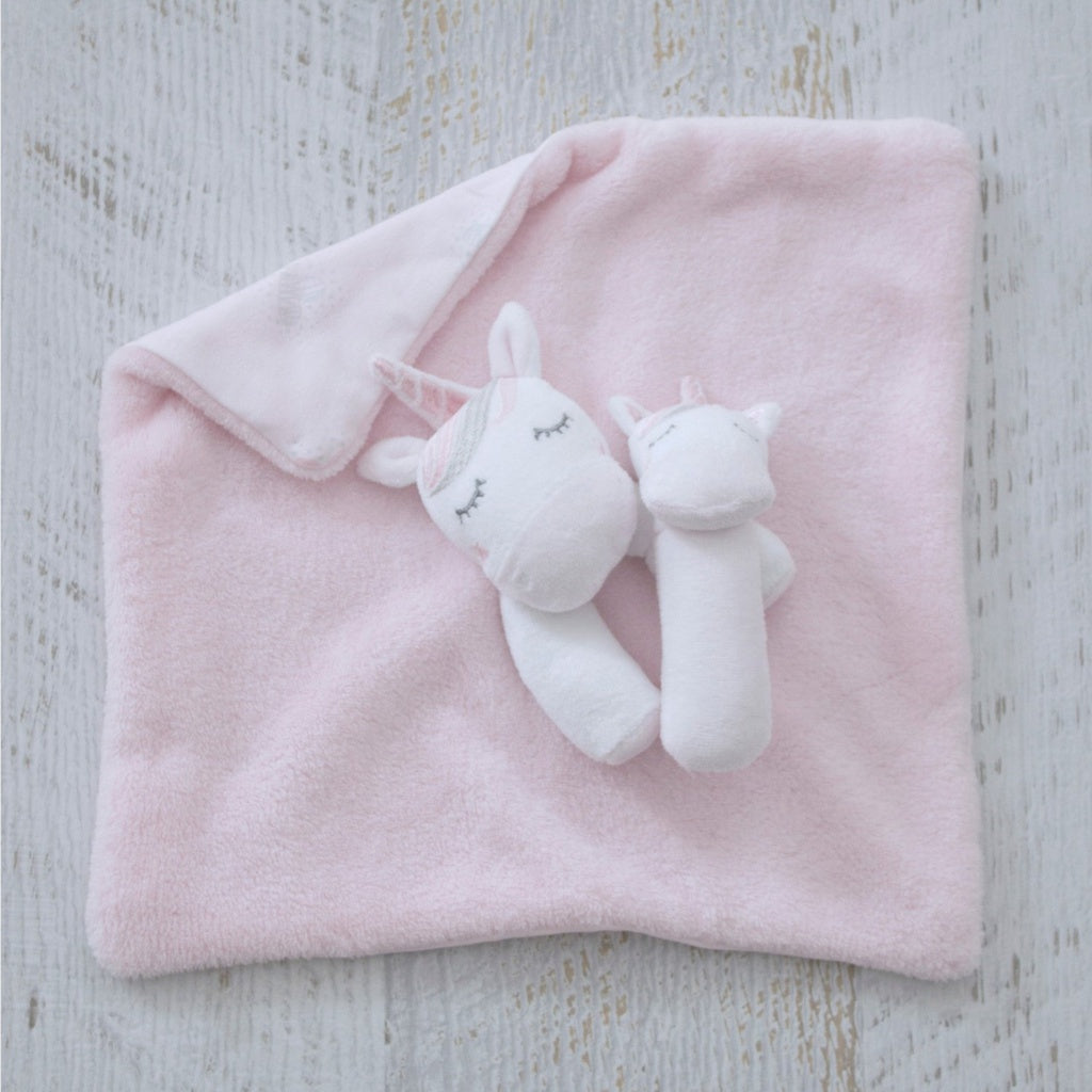 The ultimate gift set for that special baby from the Bubba Blue Unicorn Magic Collection. Super soft and cuddly security blanket helps your baby to rest easy and get to sleep in a timely manner. A cute matching rattle is perfect for tiny hands for fun and sensory play.