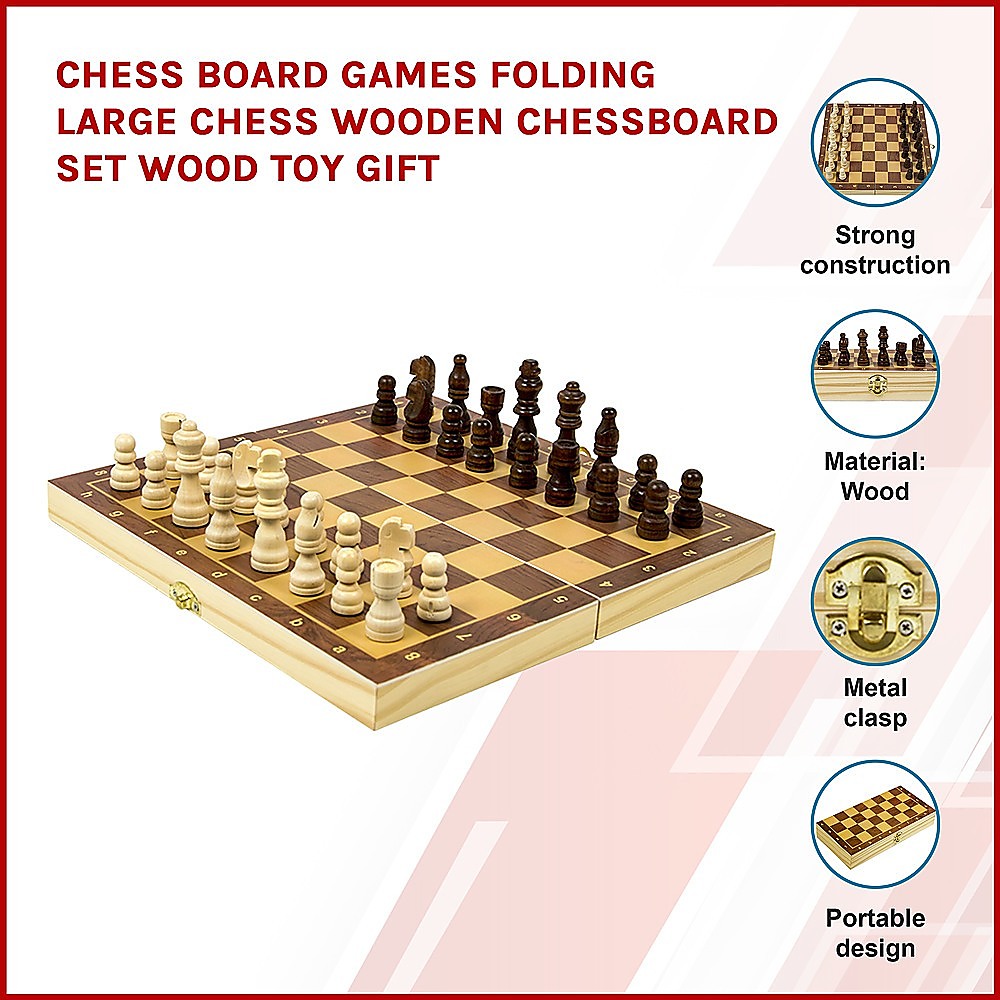 Finished with an anti-scratch surface to protect the board, the chess pieces move in near silence, allowing players to concentrate on their next move. Both board and pieces showcase the wood's grain, unlike cheap plastic alternatives. The set folds up into a box and closes with an elegant brass-tone clasp so you can take it wherever you go or store it until your next game. Whether you buy it for a gift or to reward yourself for a job well done, this chess set is designed to last a lifetime and beyond. Order yours today!