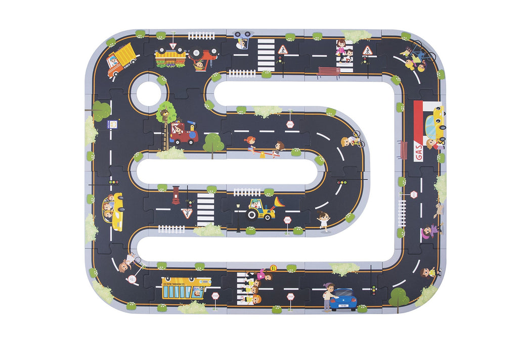 City Road Playset comprises of 20 chunky road puzzle pieces that can be arranged to create different layouts. Design your own city using the chunky puzzle road pieces. Cars not included.