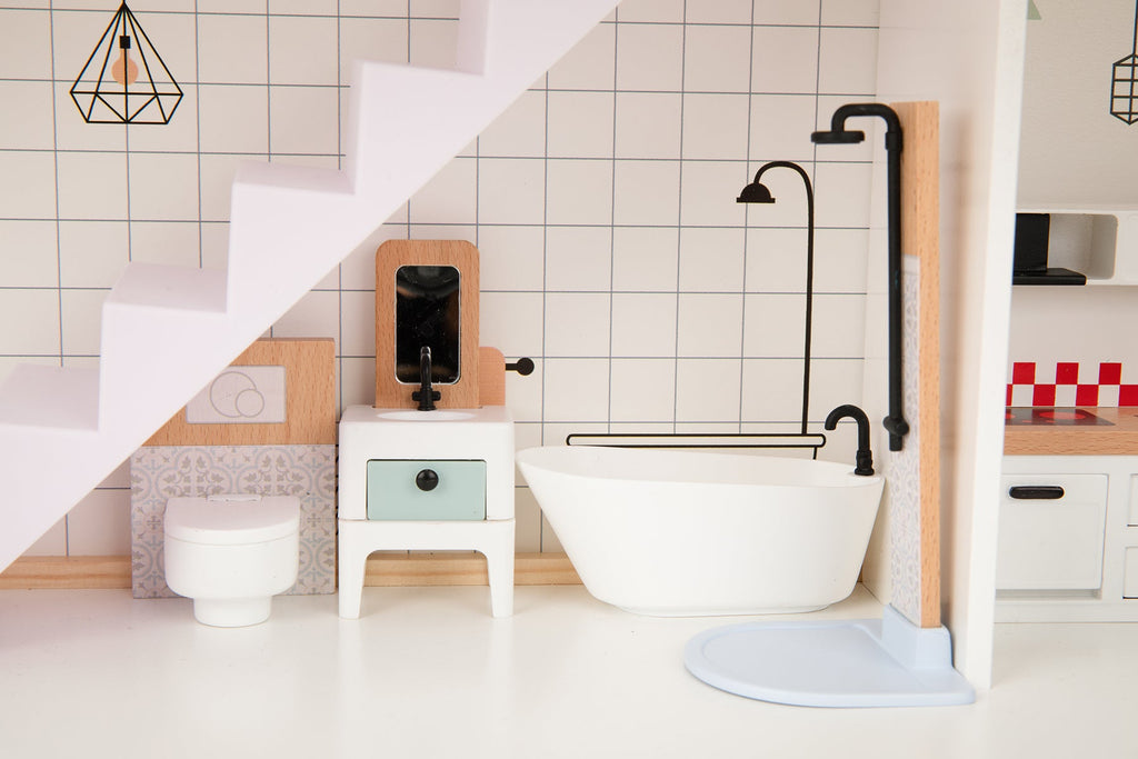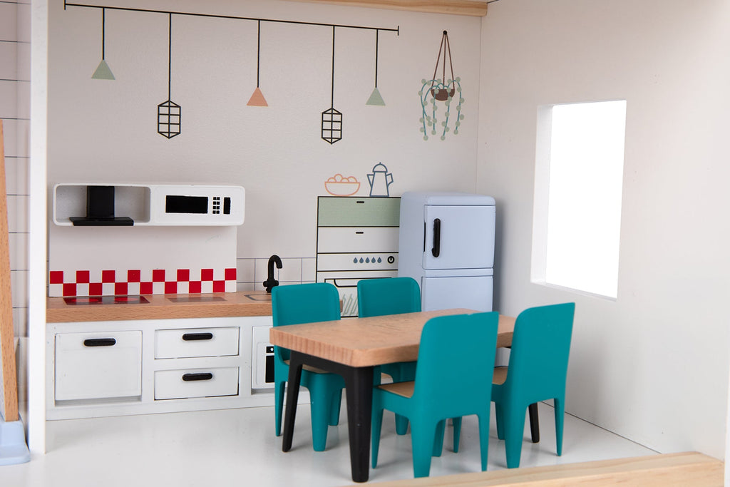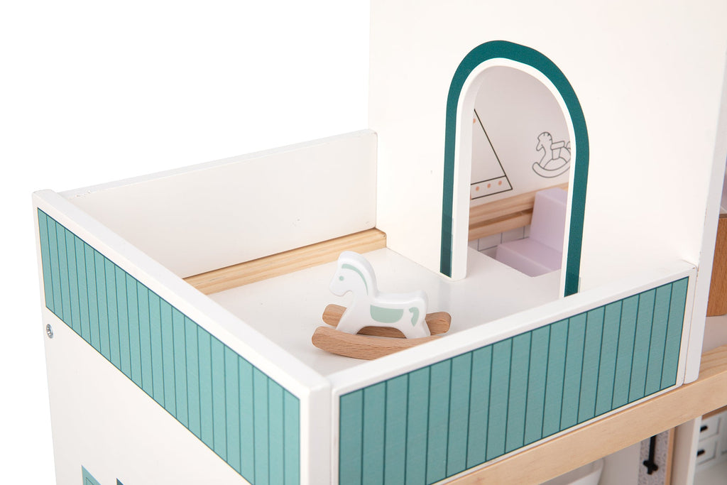 The Tooky Toys dollhouse mansion is the perfect playset. 3 levels including a master bedroom, dining room, kitchen, bathroom, and a balcony. The mansion features a family of 6 dolls. The doll house is sturdy and painted with non-toxic pastel paint. The dollhouse comes complete with the accessories. This set encourages your child to create stories and adventures for their doll family.