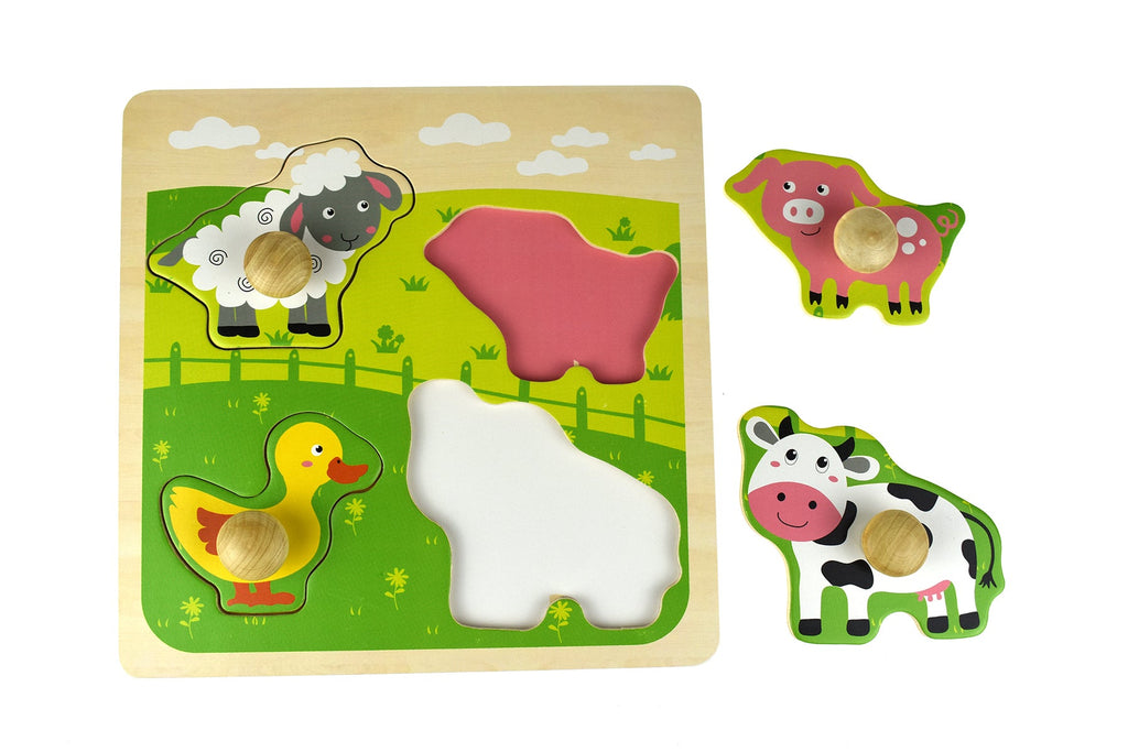 A great first puzzle, it's bright and only 4 pieces to the puzzle. Large wooden knobs make it easy for young hands to grasp and move around. The puzzle is easy to do and can be done repeatedly thus helping eye and hand coordination.