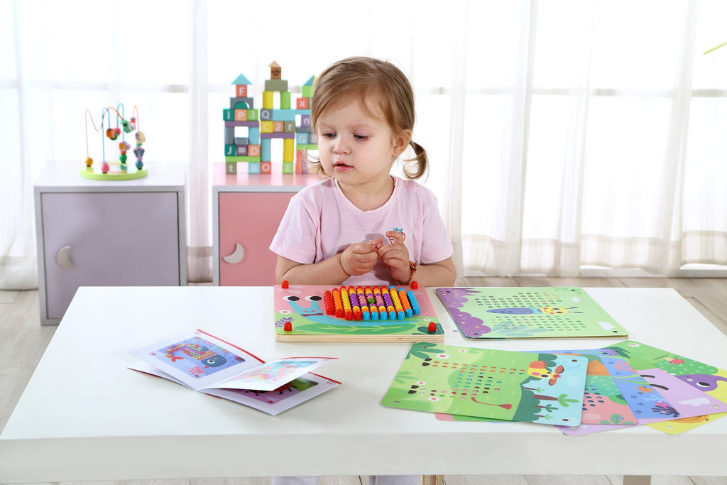 This unique peg board game teaches counting, patterns, and co-ordinations. Kids are required to select the correct colour peg and place the peg into the correct hole to form a lovely colourful picture. Included in this sets are 1 wooden peg board, a bag of plastic colourful pegs, instruction booklet and sheets of pre-printed cardboards. Also a cotton bag to carry all the small pieces.